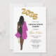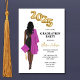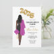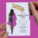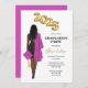 Afrikanische Amerikanerin Graduation Party Einladende Frau Porträt zeichnend schwarzes Kleid, rosa Kappe und Kleid, lange dunkle Haare. Klasse der 2024 Goldballons.