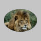 Ovales Form-Foto des afrikanischen männlichen Löwes, der sich in den Unkräutern hinlegt.