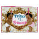 Der afrikanische Prinz oder Prinzessin Gender Reveal Gift Bag Blue, Pink und Gold Glitzer Accent Adorable African Prince mit einer Goldkrone neben einer schönen afrikanischen Prinzessin, die eine goldene Krone auf einem goldenen Rahmen auf Marmorgold und weißem Hintergrund mit goldenen Glitzer-Akzenten trägt. ©Miss Sassy Party Designs