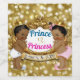 Adorable African Prince mit einer Goldkrone und einem weißen Windeln mit blauen Hausschuhen und einer schönen afrikanischen Prinzessin, die einen rosa gepanzerten Windeln mit Goldkrone trägt, und rosafarbene Hausschuhe auf einem goldenen Rahmen auf goldenem Glitzer ©2020 Miss Sassy Party Designs