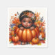 Dieses Serviettendesign besticht durch Aquarellbilder eines bezaubernden afrikanischen amerikanischen Babys mit großen, ausdrucksvollen Augen und rosa Wangen, die von innen in einen großen, dynamischen Kürbis gucken. Das geschmeidige Haar des Babys ist mit einem hübschen Blumenkopfteil geschmückt, das herbstfarbene Blume und Blätter in warmen Orangen-, Creme- und Grüntönen zeigt. Die gemütliche, festliche Szene ist umgeben von zahlreichen Herbstelementen wie Kürbissen unterschiedlicher Größe, bunten Herbstblättern und einem kleinen, niedlichen Weißvogel, der in der Nähe steht. Der Hintergrund unterstreicht die reichen, erdigen Töne der Herbstsaison mit Orangen-, Gelb- und lila Blättern. Eine gemütliche, karierte Decke verleiht der Komposition eine rustikale Touch und steigert das saisonale Ambiente. Dieses herzerwärmende Bild spiegelt den Geist des Herbstes perfekt wider und verbindet die Kultiviertheit mit dem festlichen Charme.