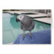 Papagei afrikanischen Graus des Kongos stehend auf ihrem blauen Tuch Poolside und dem Genießen der Sonne! Hübsche ausgebogte graue Federn gegen einen Hintergrund des Aquagrüns und -BLAUS. Vervollkommnen Sie für den Vogelliebhaber in Ihnen!