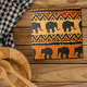 Es handelt sich um eine einzigartige dekorative Kachel, die Elefanten der Silhouette in einem afrikanischen Motiv darstellt. Die schwarzen Elefanten März über die Felder hellorange und goldfarben mit geometrischen Stammessymbolen, die das Design ergänzen.