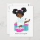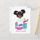 Niedlicher Wellness-Center aus schwarzem Girl, der die Beladungskarte für die Geburtstagsfeier des Schlummermädchens anpasst.