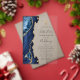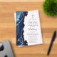 Die links Seite dieses eleganten, modernen First-Communion-Einladens besticht durch eine marineblau-blaue Aquarellgrenze mit vergoldetem Imitat-Glitzer. Über dem individuell anpassbaren Text erscheint ein Imitat mit Goldfolienkreuz, das handschriftlich, kopperplate und kursiv in Holzkohlegrau auf einem klaren Hintergrund kombiniert.