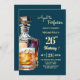 A modern birthday party invitation with bold numbers, a bottle of whiskey and a glass of whiskey. Customize the details for a unique and cool birthday celebration.