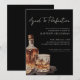 Elegant Black Whiskey-Themed Birthday Invitation. This sophisticated design features a bold black background with off-white fonts for a striking, modern look. The phrase “Aged to Perfection” appears in elegant handwritten script calligraphy across the top for a stylish introduction. A large black and white watercolor illustration of a whiskey bottle, glass, and ice is placed in the bottom left corner, adding a refined visual element.