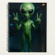 Alienígena verde em estilo 3D futurista, com grandes olhos pretos brilhantes e pele detalhada, fazendo o gesto de paz com as duas mãos. Uma presença carismática e enigmática em um cenário de luzes neon espaciais.