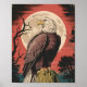 Este diseño presenta una majestuosa águila posada en un tocón de árbol, con un fondo de luna llena en un cielo crepuscular.