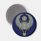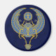 Dieser antike ägyptische Käfer hat große Flügel, die auf beiden Seiten nach oben gespannt sind. Die aufwändigen Linien des Käfers sind hellgelb gestrichen, während das Innere in einem lebhaften Blau gehalten ist. Die beiden Vorderbeine des Skarabäus gehen nach oben und halten eine Kugel mit einem einfachen Ankh-Design in der Mitte. Die vier anderen Beine des Käfers hängen zusammen mit einem weiteren Kreis unten. Dieses ägyptische Muster sitzt auf einem tiefen, blauen Hintergrund und erzeugt einen stilvollen Magneten.