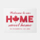 Rotes und weißes Zuhause-süße Zuhausefußmatte mit dem O im Zuhause ersetzt durch ein Ahornblatt. Addieren Sie Ihren Familiennamen auch und das Jahr, das Ihre Familie gebildet wurde.