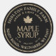 Geben Sie Ihren Firmennamen, Ihre Adresse, das Volumen des Sirup und den Ahornsirup-Grad ein. Elegantes schwarz-goldenes Etikett mit einem goldenen Ahornblatt aus Zucker.
