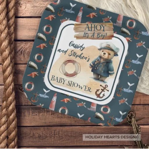 Set segelt mit unserer "Ahoy, It's A Boy" Teddy Bear Einladung und Accessoires Vorlagenkollektion für eine köstliche nautische Babydusche. Dieses charmante Design besticht durch einen Teddy-Bär, der in einer Kapitän-Uniform gekleidet ist und am Sandstrand stehend ist, mit einem hölzernen Schild "Danke!", einem Lebensbewahrer und einem Schiffsanker. Ein wiederholtes Muster von nautischen Gegenständen und Meereslebewesen auf dunkelblauem Hintergrund umgeben ihn.