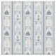 Dieses Muster-Gewebe zeigt den Slogan "Ahoy it's a boy", sowie nautische Grafiken wie Segelboote und Anker und vertikale Streifen in Blautönen vor einem cremefarbenen Hintergrund.
