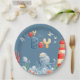 Ein schöner, tiefblauer Ozeanfarbenhintergrund mit nautischen Elementen aus Oktopus, Ankern, Walen, Wellen, Seestern und anderen Süßwassergegenständen, die dieses süße Design für die perfekte Babydusche zum Leben erwecken. Perfekte Teller für eine bezaubernde Babydusche. 100% "Kundenzufriedenheit mit "Zazzle" jeden Tag.