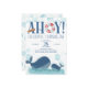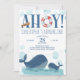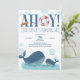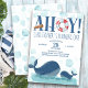 Whale Geburtstagseinladung für einen Jungen zum ersten Geburtstag oder Sie können für jedes Alter personalisieren. Das Design hat eine Aquarellbild mit glücklichen Ozeanwalen, Meeresblasen und das Wort "Ahoy", mit einem Leben Boje und Kapitänen Teleskop dekoriert.