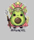 Ein niedlicher Avocado-Charakter ist als Aztekerkämpfer gekleidet, mit einer lebhaften Kopfbedeckung, Speer und Schild. Die großen Augen und die runden Wangen des Charakters verleihen seinem Krieger eine spielerische Touch. Der Text lautet "ahuacatl" (aztec for avocado)