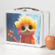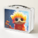 Diese Lunchbox hat ein orangefarbenes Kritter darauf.