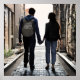 Ein Paar in der Liebe, das eine städtische Gasse mit Händen überquert. Stadtbild. Das Zimmer war sehr sauber.