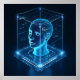 Ein futuristisches 3D-holografisches Display projiziert ein menschliches Gesicht mit kompliziertem Code und Schaltkreis und symbolisiert dabei die AI-gestützte Gesichtserkennung. Set vor neonbeleuchtetem dunkelblauen Hintergrund, leuchtende Akzente unterstreichen die Präzision und Echtzeit-Analyse der Technologie, gerahmt durch einen schlanken silbernen Rahmen mit fett formatierter Typografie.