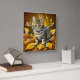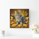 Niedlich gestreiftes graues Kätzchen, das in Herbstlauben spielt.