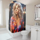 Dieser Duschvorhang hat eine hübsche KI-Dame, die darauf abgebildet ist.