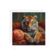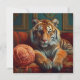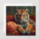 Ein AI-generiertes Bild eines Tigers, das auf einem roten Sofa liegt, mit einem großen Garnball.