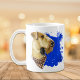 Zwei wunderschöne Aquarellbilder von majestätischen Airedale Terrier Dogs heben sich von einem strahlend blauen abstrakten Spritzer ab. Auf jeder Seite der Tasse befindet sich ein anderes Bild eines Terriers, der einen Schal trägt, mit einem eigenen Namen oder einem anderen Text in Schwarz.
