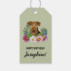 Desteis originelle Cartoon-Illustration einer niedlichen Airedale Terrier Rasse Hund Kopf nah-up umgeben von bunten Wildblumen im Sommer. Es gibt eine rot-rosa Blume, eine lila Blume, eine dunkelrosa Blume und eine weiße, dunkle Blume mit grünen Blätter und Ästen. Die Hintergrundfarbe ist grün mit einem hellen Polka-Punktmuster. Die Hintergrundfarbe kann auf eine andere Farbe geändert werden, und das Polka Punktmuster kann nach Wunsch entfernt werden. Es gibt auch zwei personalisierbare Textbereiche.