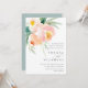 Moderne Blumen-Hochzeitseinladung in schieren pastellfarbenen Aquarellen mit einem überdimensionalen Strauß von gemalten Blüten in blassfarbenem Pfirsich und Pfefferminzgrün, wobei Ihre Hochzeitsdetails rechts unten in sanftem, grauem Schriftzeichen ausgerichtet sind.