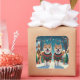 This festive design captures the joyful spirit of the holiday season, featuring an adorable dogs.Nestled in a winter wonderland, complete with a decorated Christmas tree, and beautifully wrapped presents. Snowflakes gently fall, adding a magical touch to the scene, while the vibrant colors of the holiday decorations create a warm and cheerful atmosphere.