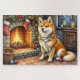 Akita Sitting by Fireplace with Christmas Lights Puzzle