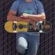 Akustische Gitarre und Vinyl-Alben-Rock'n'Roll Skateboard