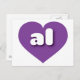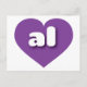 Diese Postkarte zeigt ein pulsierendes lila Herz mit den fett-, weiß-, abgerundeten, Kleinbuchstaben al, eine spielerische Abkürzung für Alabama, den Yellowhammer-Staat. Die Rückseite der Karte ist leer und wartet auf Ihren personalisierten Text oder Ihre handgeschriebene Stimmung. Ebbe!