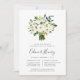 Die eleganten Proben mit Blumenstrauß laden zum Verweilen ein. Weiße Rosen in Aquarelltönen und Pfannkuchen mit üppig grünem botanischem Blattwerk und Blätter. Personalisieren Sie Ihre Dinner-Details mit Ihrer Probe in einem schicken Mix aus Block-, Serif- und Kalligraphie-Schriften. Umfasst Platz sowohl für die Probe als auch für das Abendessen oder Feiern.