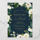 Unsere Alabaster Hochzeitseinladung umgibt Ihre Hochzeitstage-Details mit einem Rahmen aus bemaltem Aquarell, botanischem Blattwerk, weißer Rose und Blume aus Pinien auf einem reichen marineblauen Hintergrund. Ihre Hochzeitsdetails werden in schicken Goldfolien mit handgeschriebenen Akzenten dargestellt.