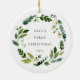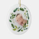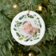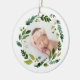 Rund Foto-Ornament zeigt das Foto Ihres Kleinen, gerahmt von einem Kranz mit grünem botanischem Blattwerk und weißen Blume. Personalisieren Sie den Rücken mit Ihrer eigenen Beschriftung (mit "[name's] first Christmas" und dem Jahr gezeigt.