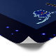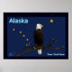 Ein Bald-Adler (Haliäetus albicilla) scannt den Himmel von seiner Terrasse auf einem Baumzweig; überlagert auf einer Fahne von Alaska. Der Text "Alaska" erscheint auch in blau-weiß. Fügen Sie Ihren eigenen zusätzlichen Text hinzu.