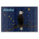 Ein Bald-Adler scannt den Himmel von seiner Terrasse auf einem Baumzweig, überlagert auf einer Fahne von Alaska. Der Text "Alaska" erscheint auch in blau-weiß.
