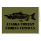 Eine schwarze Linie, die von einem Sockeye Lachs (Oncorhynchus nerka) gezeichnet wird, mit anpassbarem Text mit dem Text "Alaska Combat Fishing Veteran". Die Lachsfischerei in Alaska ist sehr beliebt, zu beliebt in Alaska. Stellen Sie sich Tausende von Anglern vor, fast Schulter zu Schulter, die beide Ufer eines Baches belästigen und versuchen, in der Hoffnung, einen großen Lachs zu landen, die Überquerung von Linien mit allen anderen zu vermeiden. Alasker nennen das Fischerei. Werben Sie für Ihren Veteranen-Status.
