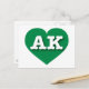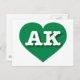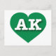Auf dieser Postkarte befindet sich ein Öko-grünes Herz, das die fett-, weiß-, Großbuchstaben AK, die offizielle Abkürzung für Alaska, die letzte Grenze, enthält. Die Rückseite der Postkarte ist leer und wartet auf Ihren personalisierten Text oder Ihre handgeschriebenen Gefühle.
