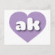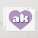 Auf dieser Postkarte befindet sich ein weiches Lavendelherz, das die fett-, weiß-, abgerundeten, Kleinbuchstaben enthält, eine spielerische Abkürzung für Alaska, den Staat der Grenze. Die Rückseite der Postkarte ist leer und wartet auf Ihren personalisierten Text oder Ihre handgeschriebenen Gefühle.
