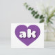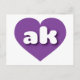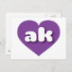 Diese Postkarte zeigt ein pulsierendes lila Herz mit den fett-, weiß-, abgerundeten, Kleinbuchstaben, eine spielerische Abkürzung für Alaska, den Staat der Grenze. Die Rückseite der Postkarte ist leer und wartet auf Ihren personalisierten Text oder Ihre handgeschriebenen Gefühle.