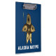Ein braunes Fraktal-Bild, das auf einen hochstilisierten Inuit-Jäger hinweist, der traditionelle Pelzkleidung trägt und einen Harpunen mit Elfenbeinkopf trägt. Text liest "Alaska Native" auch.