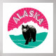 Vintage-Reisebild für Alaska mit einem Bären vor einer Bergkette. Vintage Reiseplakate geben uns einen nostalgischen Rückblick auf den idealisierten Stil, die Mode, den Transport und die beliebten Reiseziele der Vergangenheit.