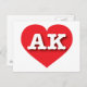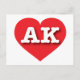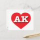 Auf dieser Postkarte befindet sich ein lebendiges rotes Herz mit den fett-weißen Großbuchstaben AK, der offiziellen Abkürzung für Alaska, die letzte Grenze. Die Rückseite der Postkarte ist leer und wartet auf Ihren personalisierten Text oder Ihre handgeschriebenen Gefühle.