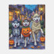 Adorable Alaskan Malamutes, gekleidet in verspielten Halloweenkostümen, tragen Kürbiseimer, während sie unter dem mondbeleuchteten Himmel tricksen oder behandeln. Dieses festliche Design hebt den dicken Mantel der Rasse, den starken Bau und den abenteuerlichen Geist hervor, der perfekt die gespenstische und dennoch lustige Atmosphäre Halloween Nacht einfängt. Eine wunderbare Feier für Hundefreunde und Halloween-Fans gleichermaßen.
