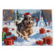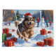 Eine herzliche Ferienillustrierung mit einem fröhlichen Hund, der im Schnee spielt, eine Weihnachtsmannmütze trägt und von bunten Geschenkboxen umgeben ist. Im Hintergrund bauen die Kinder neben einem schneebedeckten Weihnachtsbaum einen Schneemann und schaffen so ein fröhliches Winterwunderland. Ideal, um Feiertagssjubeln zu verbreiten und den Zauber von Weihnachten zu erfassen.
