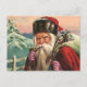 Dieser ernstzunehmende Weihnachtsmann hat die Berge getretet, um Ihnen Weihnachtswünsche zu bringen. Er ist modern in einem warmen roten Mantel gekleidet, der mit hellrosa Handschuhen besticht. Er ist bereit für Ihre persönliche Nachricht. Im behalt zum antiken Stil weist die Rückseite der Postkarte auch ein Design aus dem 19. Jahrhundert auf.