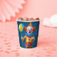 Sostiene un grupo de globos (principalmente azules y amarillos) en su mano izquierda. Al lado derecho, se aprecian varias serpentinas flotando en el aire. Todo esto se presenta sobre un fondo azul sólido y liso, que resalta los colores del personaje.